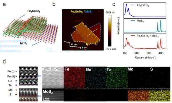 Raman spectroscopy in Figure 1c further verifies the chemical integrity of the constituent layers. Pristine Fe3GeTe2 shows a characteristic vibrational mode at ~120 cm−1, which belongs to the vibration of the Fe-Ge-Te bond, whereas the MoS2 layer shows its signature phonon modes at ~380 cm−1 (E2g1) and ~408 cm−1 (A1g) [46,47]. Importantly, the heterostructure spectrum retains all characteristic peaks of both materials without obvious displacement, confirming the preservation of individual material properties and negligible interfacial strain or chemical reactions.