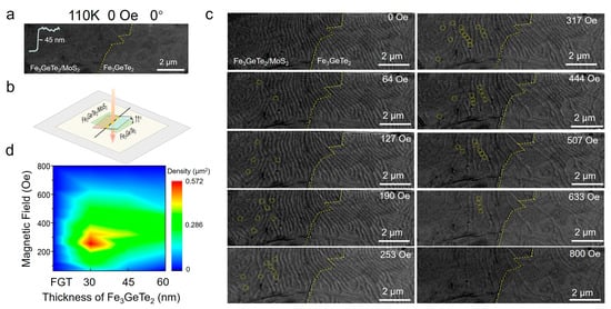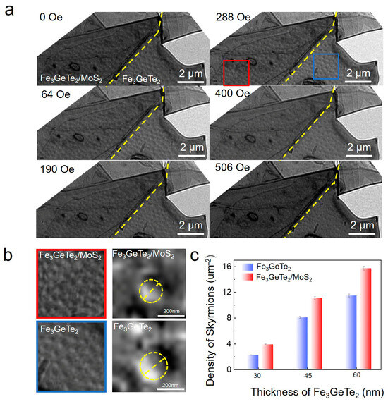 High-magnification images at 228 Oe (Figure 3b) compare the magnetic response of the Fe3GeTe2/MoS2 heterostructure with pristine Fe3GeTe2. Both exhibit circular skyrmions with clear contrast, and the observed light-dark contrast at the edges confirms their Néel-type morphology. Notably, skyrmions in pristine Fe3GeTe2 have an approximate diameter of ~200 nm, whereas those in the heterostructure are smaller (~170 nm). This comparison directly verifies the influence of the MoS2 interface on skyrmion size.