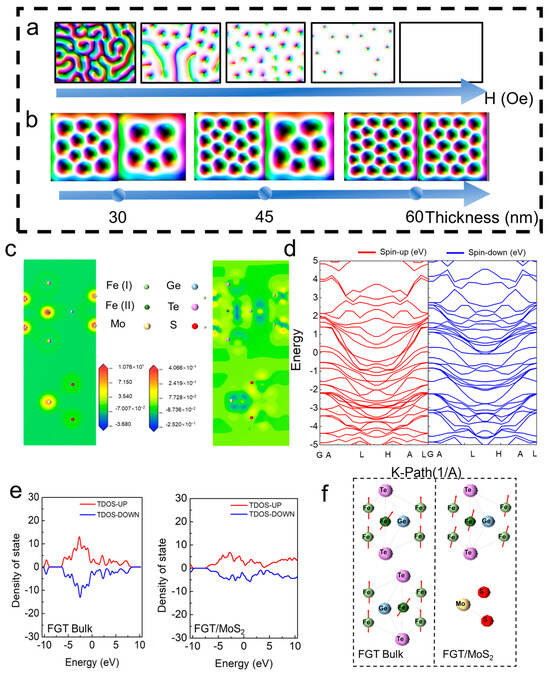 Having established the dominance of the interfacial DMI, we proceed to elucidate its microscopic origin and the physical basis of its thickness dependence. To this end, we combined micromagnetic simulation (MuMax3, version 2.1.2) with first-principles calculations [57]. This multiscale approach links experimentally observed magnetic textures to the behavior of electrons and magnetism at the atomic scale. Micromagnetic simulations were conducted using MuMax3 (2.1.2), assuming a moderate interfacial DMI strength (D = 1.0 mJ/m2) for Fe3GeTe2/MoS2 heterostructure and Fe3GeTe2 films of varying thicknesses (30–60 nm). The simulations successfully reproduce the experimental evolution of skyrmion nucleation and kinetics (Figure 4a,b). Figure 4a presents a micromagnetic simulation of the magnetic domain evolution of a Fe3GeTe2/MoS2 heterostructure varying with an applied magnetic field under the ZFC condition. Starting from the striped domain structure consistent with the initial magnetic state of the bulk Fe3GeTe2 in the low field, the system transitions to the Néel-type skyrmion lattice in the intermediate field and then saturates to uniform out-of-plane magnetization in the high field.