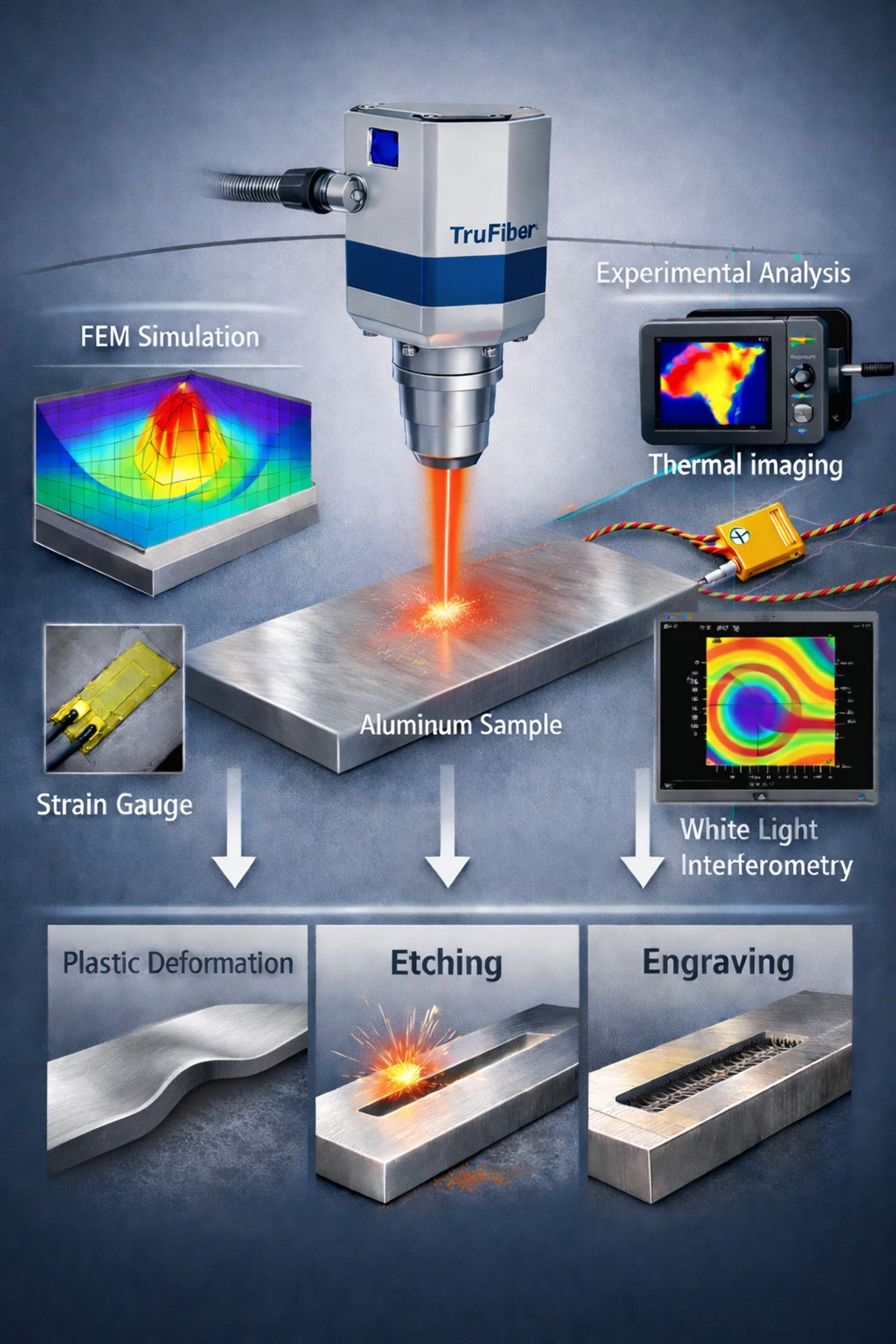 The key novel aspects of the study include: (a) the development of a precise 3D transient coupled thermo-structural model that accurately simulates both static and dynamic laser irradiation, capturing the transition from plastic deformation to material removal (etching, engraving) within a single computational framework, (b) the extensive experimental validation using a multi-diagnostic approach (thermal imaging, interferometry, strain gauges) that provides simultaneous data on thermal gradients, surface topography, and mechanical strain, offering a holistic view for model verification, and (c) the demonstration of this model’s predictive capability for controlling surface modification outcomes—from permanent marking via plastic strain to precise engraving depth—by tuning laser parameters, providing a valuable tool for optimizing industrial laser machining processes without the need for costly trial-and-error.