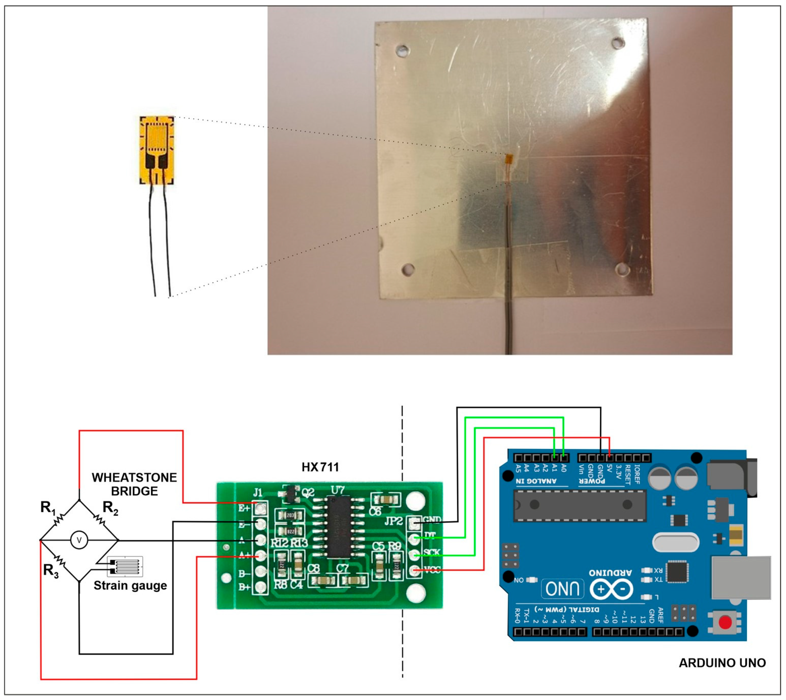 ) is the active strain gauge. An HX711 24-bit analog-to-digital converter (AVIA (Avia Semiconductor), Fuzhou, China) is used to accurately measure the resulting imbalance voltage from the Wheatstone bridge. The Arduino processes the voltage data to calculate the strain in real-time, with results displayed on a computer via a custom data logging program. The strain (