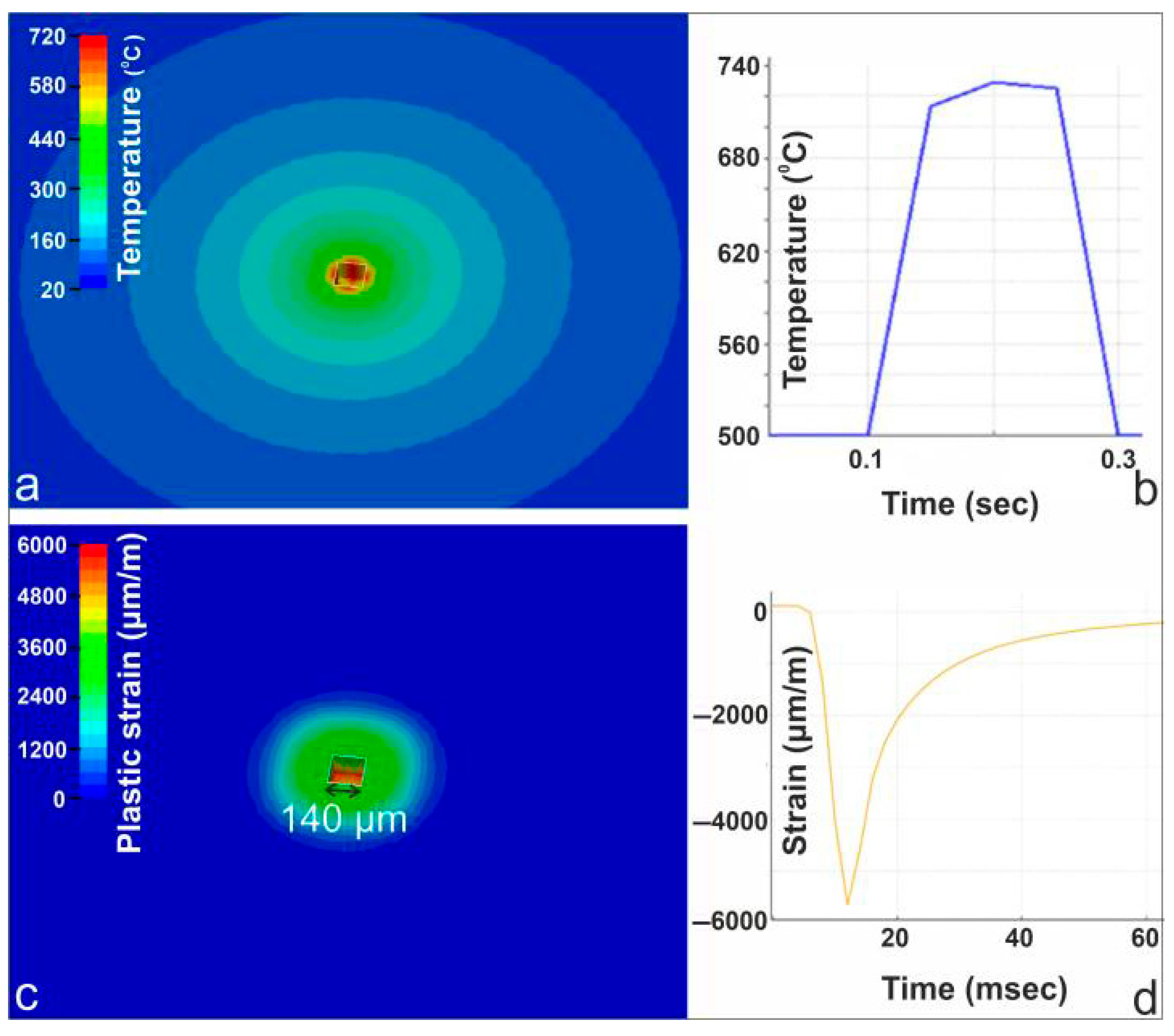 Figure 6 presents the combined numerical and experimental characterization of the 250 W static laser irradiation case. The FEM-generated temperature field in panel (a) shows a highly localized hotspot exceeding the melting point at the beam center, with smooth radial decay, at 150 ms after laser irradiation. The corresponding thermal-camera measurement in panel (b) peaks near 740 °C before cooling, in close agreement with the simulated thermal response. Panel (c) illustrates the FEM-predicted plastic strain distribution, revealing a compact plastically deformed zone, at 150 ms after laser irradiation. The material removed due to mechanical failure has a width of 140 µm and a depth of 100 µm. Panel (d) displays the strain-gauge response during irradiation, capturing a sharp compressive strain excursion approaching −6000 µm/m, followed by partial recovery during cooling. This strain evolution is consistent with the predicted concentration of plastic deformation at the beam center.