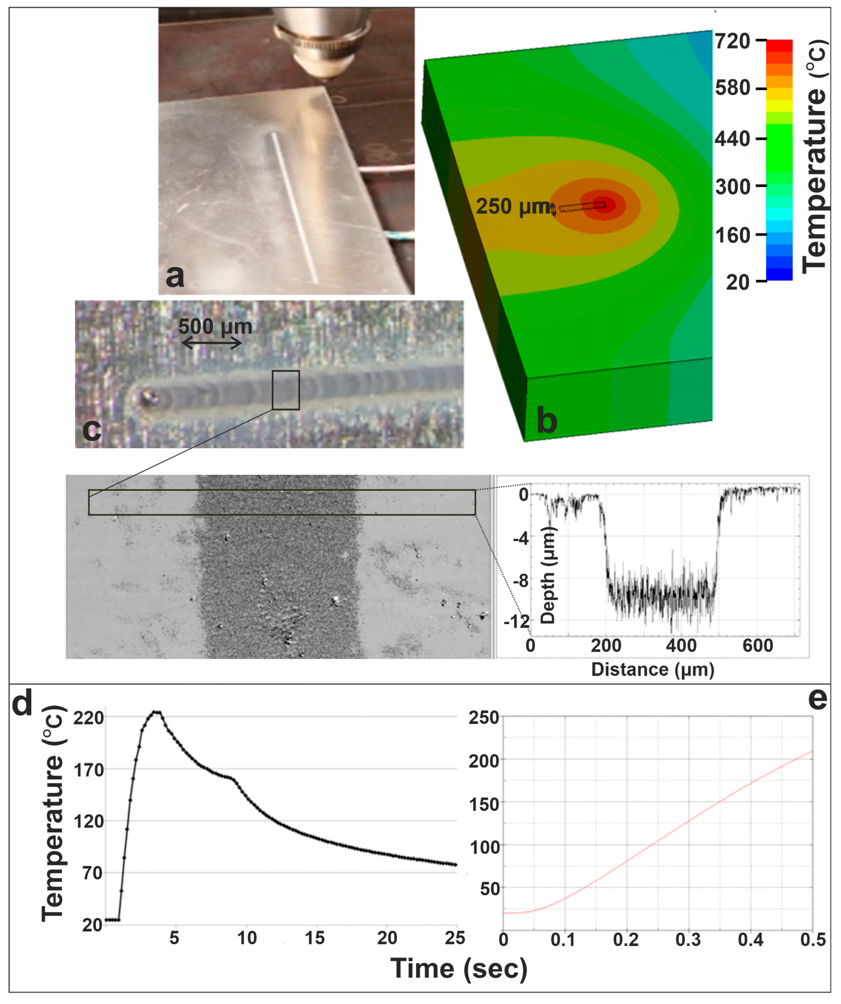 Figure 9 presents the results of the 200 W linear laser irradiation at 75 mm/min, illustrating the onset of etching and validating the numerical predictions against experimental measurements. Panel (a) shows the laser etching experiment, where the CW beam produces a shallow etched track along the scan direction. The corresponding FEM temperature field in panel (b) indicates that the moving laser spot reaches temperatures high enough to initiate localized melting, forming an elongated high-temperature zone responsible for material removal, at 300 ms after the start of laser irradiation. WLI (panel (c)) confirms the formation of a well-defined etched groove, with the extracted surface profile revealing a depth of approximately 10 µm and a width of 250 μm. These measured values agree well with the simulated results that predicted the same values. Moreover, at a distance of 2 mm from the center of the moving laser beam, the K-type thermocouple positioned at this location measured a maximum temperature of 220 °C, while the FEM simulation predicted a maximum temperature of 210 °C at the same distance, resulting in a percentage difference of 4.5% at 500 ms after the onset of laser irradiation. Panel (d) shows the thermocouple measurements taken near the beam path, at a distance of 2 mm from the center of the moving laser spot, capturing the sharp temperature rise as the laser passes the closest point, followed by gradual cooling, while panel (e) illustrates FEM-predicted temperature evolution for the same distance near the beam path.