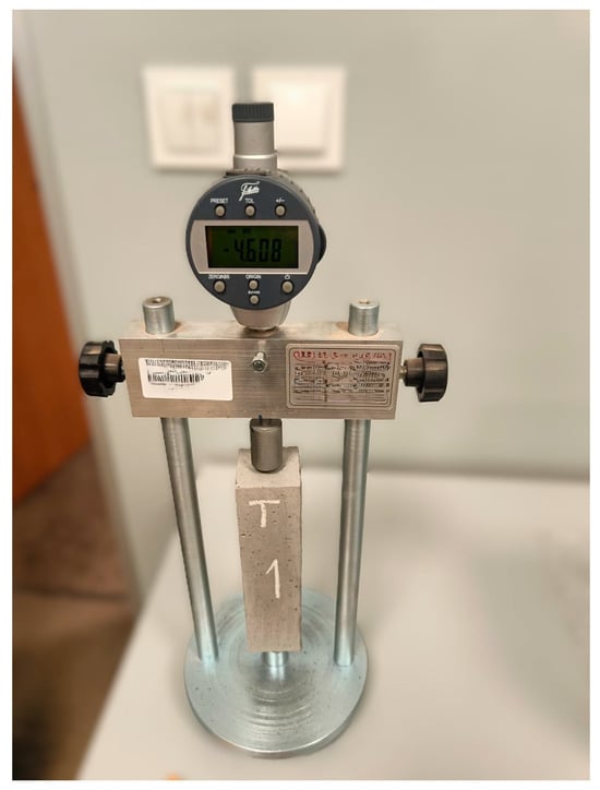 The Linear Shrinkage Test (LST) method involves preparing standard mortar specimens in molds measuring 40 × 40 × 160 mm and is based on EN 12390-16 [26]. Steel reference points are embedded at both ends of each specimen. After 24 h of curing in molds, the specimens are placed vertically in a measuring frame equipped with a dial gauge. An example of the testing setup and a specimen with embedded reference points is shown in Figure 4.