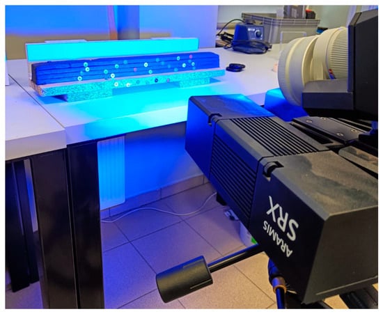 To ensure proper illumination, an external photographic lamp was used, and the entire experimental setup is shown in Figure 6. Similarly to the Aramis system, fixed reference points were applied. Because there was no automatic sample size detection function, a reference scale with known dimensions was placed on the platform to enable later image scaling.