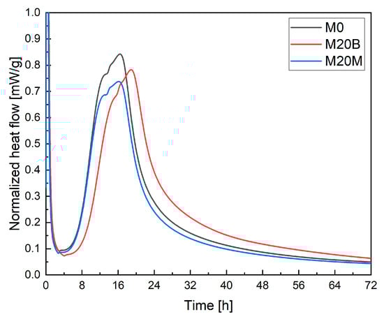 The calorimetric results (Figure 9) indicate noticeable differences in the hydration kinetics between the analyzed mixtures. The reference sample M0 exhibited the most prominent exothermic peak, occurring at approximately 15–17 h, corresponding to the main acceleration phase of hydration. In contrast, the M20B mixture showed a lower peak intensity and a delay in its onset of around 2–3 h. This behavior suggests a partial retardation of early hydration reactions. The delayed occurrence of the central exothermic peak in M20B can be attributed to the presence of porous aggregate, which absorbs additional mixing water and gradually releases it during later stages of hydration. This process provides internal curing, maintains internal moisture, and supports continuous hydration. However, in the early phase, reduced free water availability limits ion mobility and slows the dissolution of clinker minerals, thereby extending the induction period and delaying the onset of the acceleration stage. As hydration progresses, the slow release of water from the pores reactivates the reactions, resulting in a prolonged and broader heat flow curve. Consequently, M20B shows slower but more sustained heat evolution than M0. The M20M mixture, in turn, exhibited the lowest peak magnitude with almost no time delay, indicating that partial incorporation of magnetite sand reduces reaction intensity without significantly altering the hydration kinetics. Overall, the results suggest that the internal curing effect in M20B delays the early hydration process while enhancing long-term reaction stability, as reflected in the extended heat-release profile.