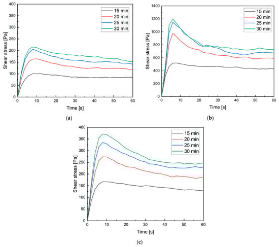 The static yield stress (SYS) was measured at 5 min intervals, starting 15 min after the water-cement contact. Each measurement was preceded by a pre-shear at 100 s−1 to achieve a homogeneous structure. The actual measurement was performed over 60 s at a constant shear rate of 0.1 s−1. Thixotropy was evaluated using a hysteresis loop test. As with SYS, the measurement was preceded by pre-shearing. The shear rate was ramped from 0.1 s−1 to 100 s−1 and then returned to 0.1 s−1 to determine the loop area and thixotropic behavior. The recovery rate was assessed by determining SYS before and after intensive shearing simulating pumping. In the first stage, the sample was sheared for 60 s at 0.1 s−1, then at 100 s−1 for 30 s, and finally again at 0.1 s−1 for 60 s. The recovery rate was calculated as the ratio of SYS after shearing to the initial SYS and expressed as a percentage.