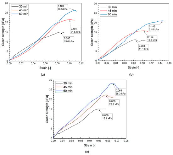 As a preliminary test to qualify mixtures for printability, green strength measurements were conducted. Green strength was evaluated on cylindrical specimens with dimensions of 120 × 60 mm. An electromechanical testing machine with a maximum force capacity of 500 N and precise displacement measurement was used. Force and displacement data were recorded using a QuantumX amplifier (Hottinger Brüel & Kjær, Darmstadt, Germany) at a frequency of 5 Hz. During testing, the crosshead was displaced at a constant rate of 0.25 mm/s. The specimens were cylindrical, measuring 60 mm in diameter and 120 mm in height. Tests were performed at 30, 45, 60, and 75 min after mixing to evaluate the early development of material strength.