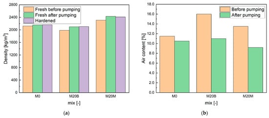 The density of the fresh concrete mix was measured using a 1 L graduated cylinder in accordance with EN 1015-6:2000 [29]. The cylinder was filled in layers, with each layer properly compacted. Measurements were carried out twice: first for the mix directly after mixing, and then after it passed through the pump. Additionally, the air content of the fresh mix was determined in accordance with EN 1015-7:1998 [30], both before and after the printing process.