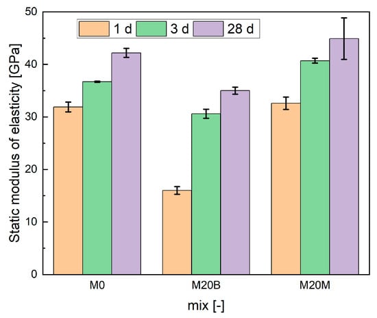 The static modulus of elasticity of concrete was determined on cylindrical specimens with dimensions of 100 × 200 mm. The specimens were tested at 1, 3, and 28 days of age to evaluate the early and later-age stiffness development.