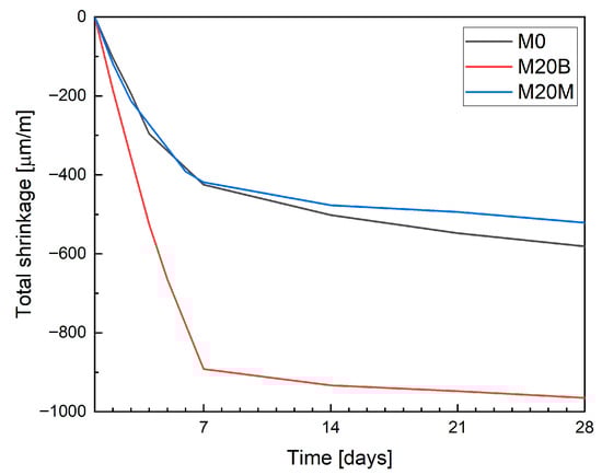 Measurements were taken after 1, 2, 3, 7, 14, 21, and 28 days. For each mixture, three specimens were tested, and the mean value of shrinkage was calculated.