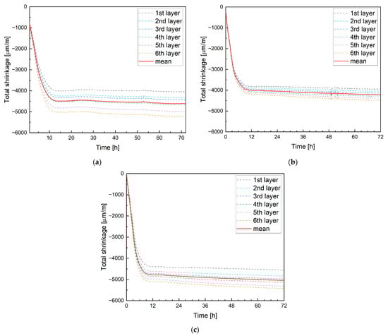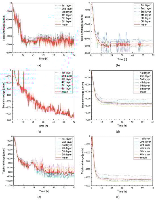 The results of this study confirm that the total shrinkage observed during the first hours of curing in 3D-printed concrete elements is substantial. Similar observations have been reported in previous research. Moelich et al. [22] reported plastic shrinkage values of approximately 6000 µm/m in 3D-printed concrete elements, noting that the risk of cracking was significantly higher than in conventionally cast concrete. Likewise, Markin and Mechtcherine [35] presented a comparable experimental setup for plastic shrinkage measurement to that used in the present study, reporting deformation levels approaching −9000 µm/m.