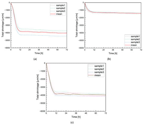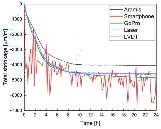 Furthermore, the measurement duration was limited to 24 h. This decision was based on earlier findings showing that after the first 12 h, the deformation rate significantly decreases and the shrinkage curve stabilizes. Extending the measurement beyond 24 h, therefore, provided limited additional insight into early-age deformation behavior while unnecessarily prolonging the test.