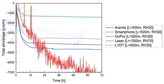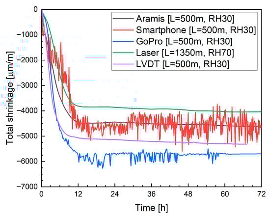 To enable a consistent comparison of different shrinkage measurement techniques, all methods were applied under identical boundary conditions and on the same printed specimens. The objective of this comparison stage was not to establish statistical equivalence between methods, but to verify their consistency in capturing early-age deformation trends under controlled conditions and to assess their practical comparability when applied to the same printed element. For this reason, an attempt was made to perform all types of measurements on the same specimen under constant temperature and humidity conditions. To achieve this, the experimental setup for shrinkage measurements using laser displacement sensors was modified, and the specimen length was reduced from 1350 mm to 500 mm. This reduction allowed the application of multiple measurement techniques within a single experimental configuration while maintaining comparable boundary conditions.