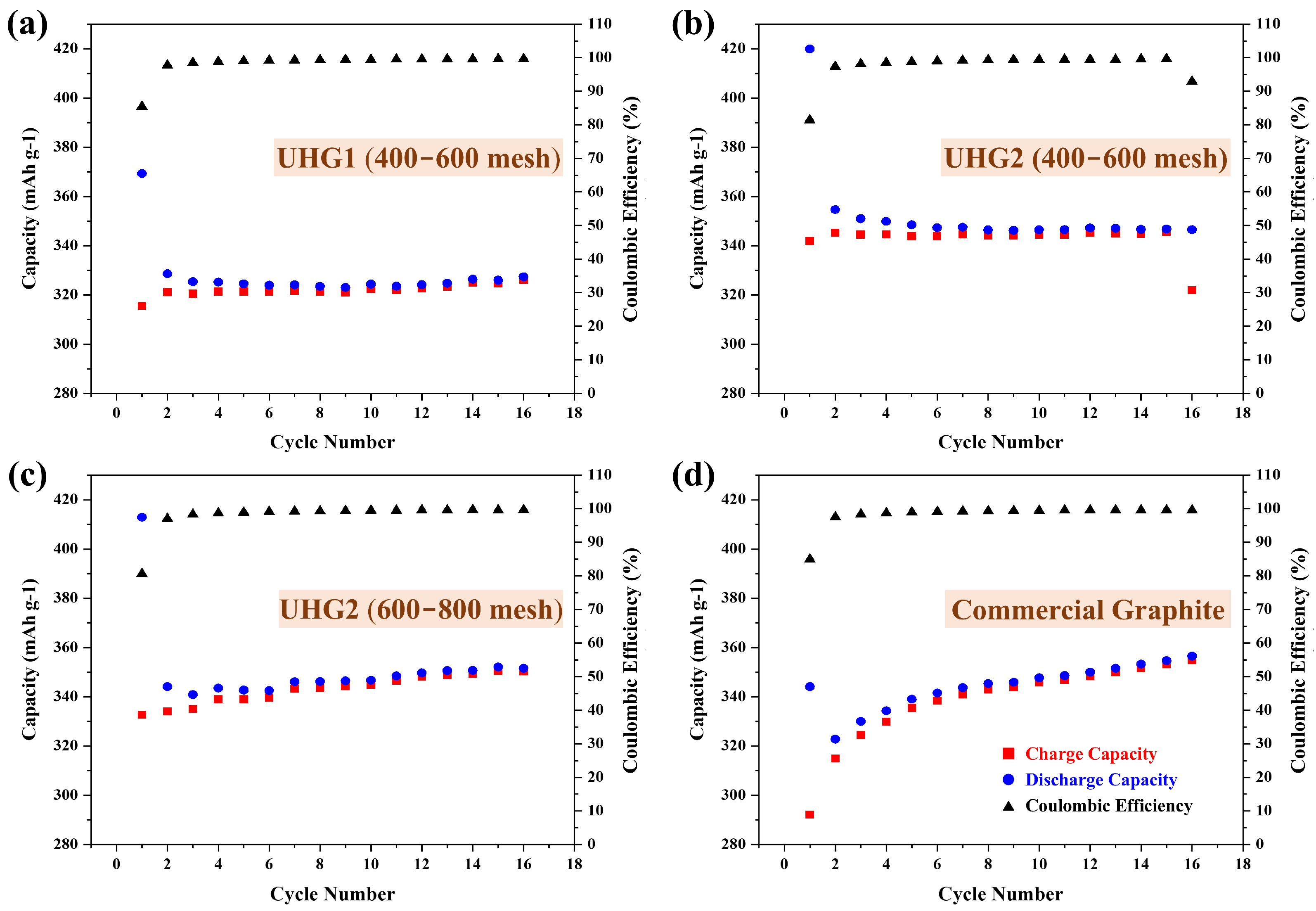 Table 1). Notably, the initial coulombic efficiency of the UHG2 sample is lower than that of commercial graphite. While commercial graphite achieves an initial efficiency of 85% at 0.2C, UHG2 only reaches 81%. This lower efficiency is likely attributed to the larger specific surface area of the UHG samples, which leads to a drop after the first cycle. Previous studies indicate that an excessive specific surface area causes higher lithium-ion consumption during the formation of the solid electrolyte interphase in the first cycle [