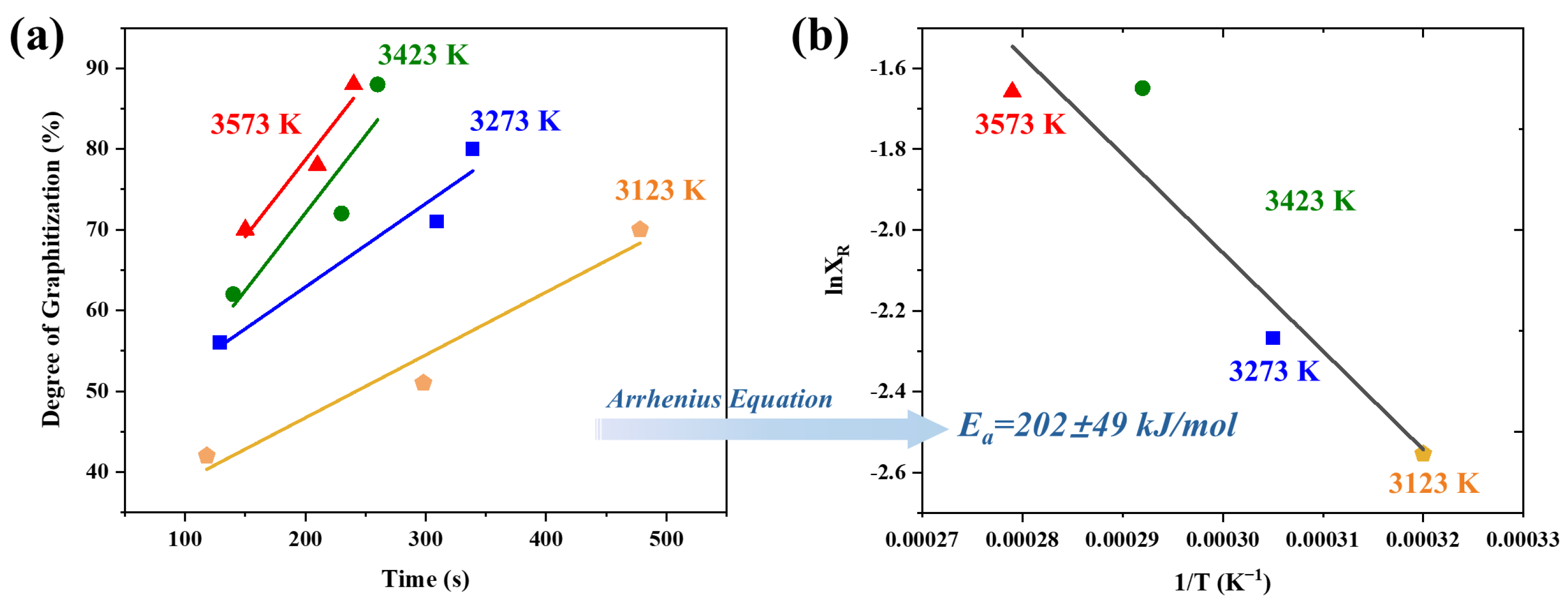 Figure 5b. The activation energy for the UHG process at a heating rate of 1000 K/min was determined to be 202 ± 49 kJ/mol. As a comparison to the standard Acheson graphitization process, the activation energy for conventional graphitization typically reaches 230 ± 15 kJ/mol [