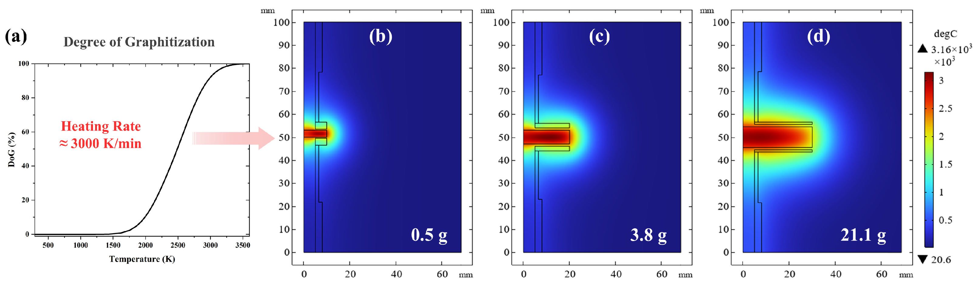 As discussed thereafter, ultrafast graphitization was observed at extremely high temperatures above 3000 K. As a result, we carried out experimental work using small coke batches of 0.5 g. We validated the simulations against experiments based on 0.5 g batches; however, such a small sample mass was not favorable to reduce the energy consumed during the graphitization. In the second step, we employed simulation for larger coke batches of 3.8 g and 21.1 g of needle coke.