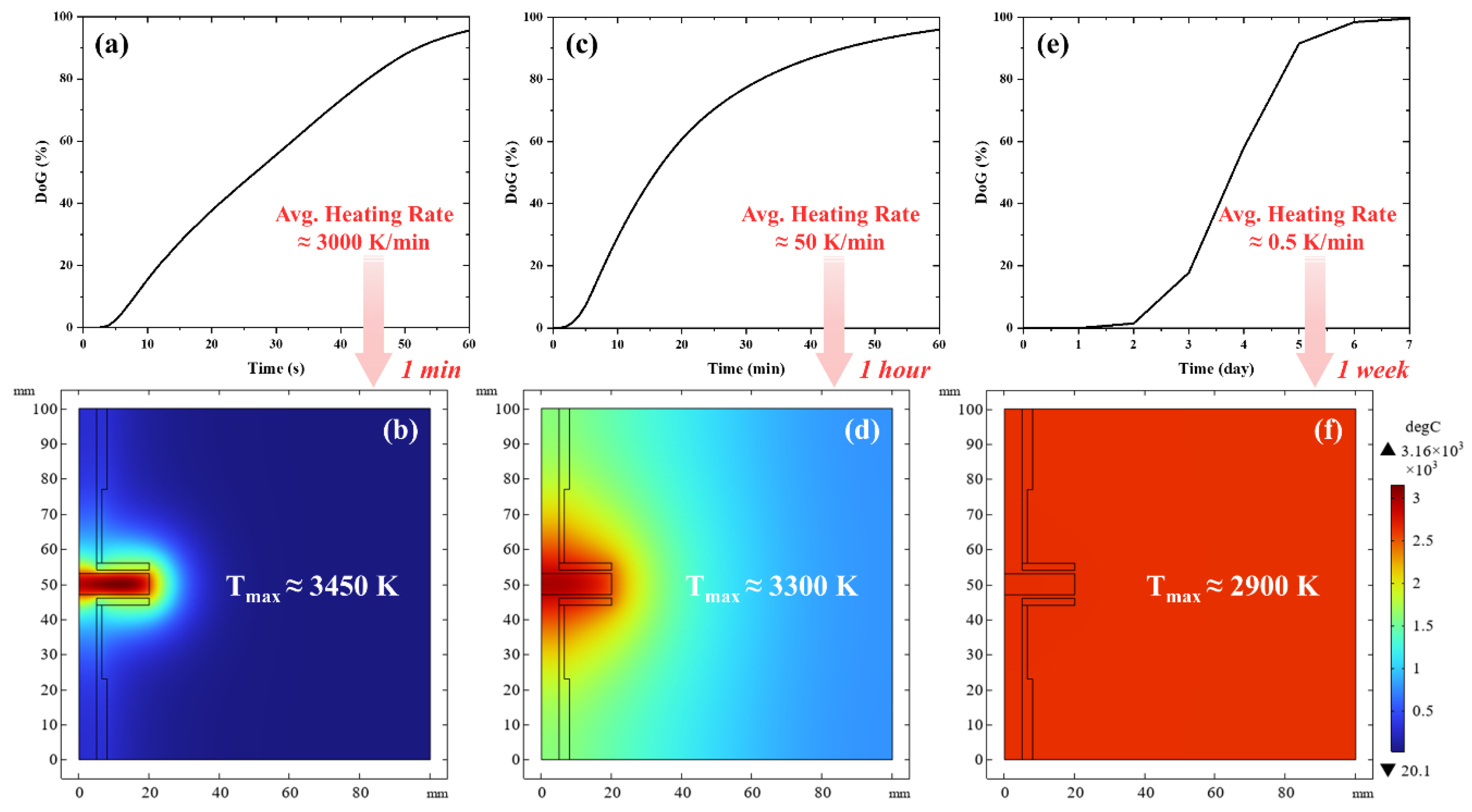 To further elucidate the relationship between energy consumption and processing kinetics, additional simulations were conducted to investigate the time duration dependency of the graphitization process. Heating simulations were performed for the 3.8 g batch under three distinct time scales, setting as a target a 95% graphitization within 1 min, 1 h, and 1 week, roughly matching the Acheson process. The simulation plots the corresponding temperature distribution in