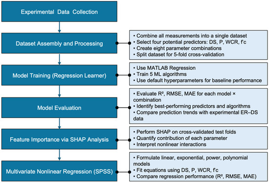 This section presents the development of machine learning regression models used to predict the apparent electrical resistivity (ER) of concrete. The workflow involved dataset preparation, construction of parameter combinations, model training, and performance evaluation to ensure the models generated accurate and reliable predictions.