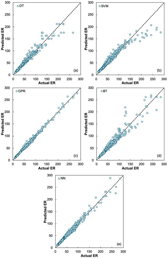 Predicted versus actual apparent electrical resistivity (ER) for the (a) Decision Tree (DT), (b) Support Vector Machine, (c) Gaussian Process Regression, (d) Ensemble (BT), and (e) Neural Network (NN) models.