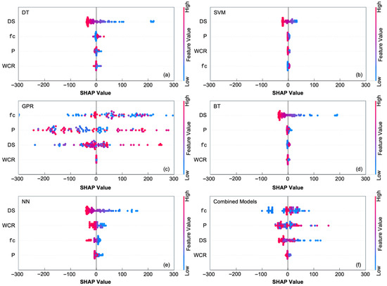 SHAP summary plots showing the distribution of feature contributions for the (a) Decision Tree (DT), (b) Support Vector Machine (SVM), (c) Gaussian Process Regression (GPR), (d) Boosted Trees (BTs), (e) Neural Network (NN), and (f) combined-model evaluation.