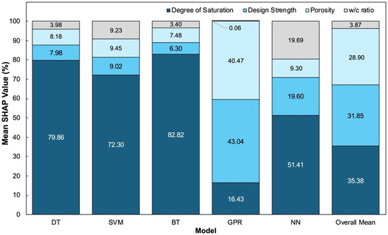 SHAP analysis was performed to evaluate how each input variable contributed to the predictions of the machine learning models. The computations were carried out in Google Colab using the SHAP library, which provides a model-agnostic approach for interpreting prediction outputs. SHAP, based on cooperative game theory, assigns importance values by estimating each feature’s marginal influence on the model’s prediction. This allows both point-wise interpretation and overall assessment of feature relevance. SHAP values were generated using the test portions of the five-fold cross-validation process, and the mean absolute contributions were normalized such that the total importance for each model summed to 100% [129,130]. This procedure enabled consistent comparison of variable influence across all models and parameter combinations, reflecting both linear and nonlinear relationships captured by the machine learning algorithms.