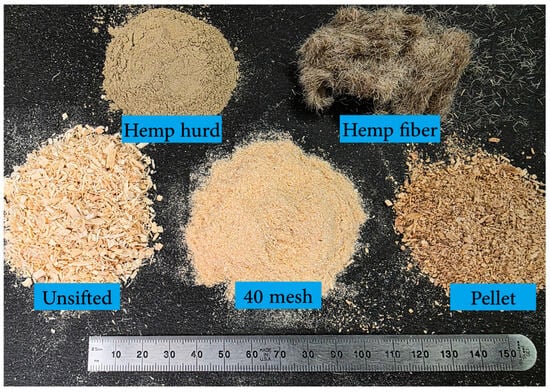 The composites consisted of wood fibers (WF), SS, HH, and HF in varying amounts. Three different WF types (WFT) were tested, (1) unsifted WF provided by Plummer Forest Products (Post Falls, ID, USA), referred to as unsifted; (2) the same wood fibers sifted through a 40-mesh sieve, referred to as 40 mesh; and (3) commercial wood pellets (bulk pellets) were purchased through North Idaho Energy Logs [35], which were ground in 100 g batches using a coffee grinder and referred to as pellet. Commercial SS solution (37%) purchased from ThermoFisher Scientific (Pittsburgh, PA, USA) was used as resin. Micronized HH was provided by United Fiber Co. (Savannah, MO, USA) HF , in the form of “Degummed Hemp Sliver” was purchased from Hemptraders.com. The fiber bundles were chopped to 3 mm lengths using an automatic textile ribbon cutter [36]. The solid constituents are shown in Figure 1.