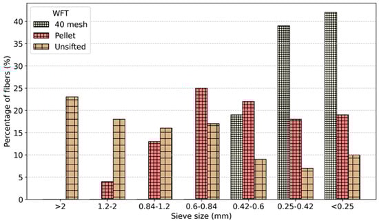 Sieve analysis for all three WFT are shown in Figure 3. The unsifted WF exhibited the largest particles, with 23% of its fibers exceeding 2 mm. Pellet WF contained no particles larger than 2 mm. When considering all particles greater than 0.6 mm, unsifted WF had the highest proportion, at 57%, followed by pellets WF at 42%. The 40 mesh WF contained no particles larger than 0.6 mm.