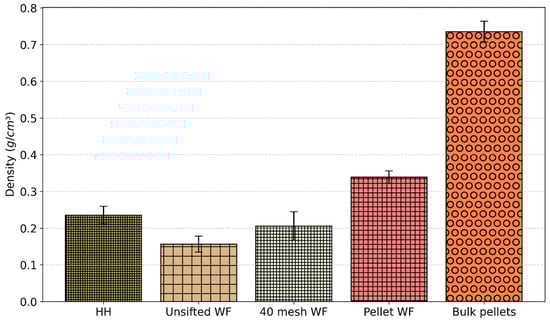 Bulk densities of the materials are shown in Figure 4. Bulk pellets had the highest density at 0.74 g/cm3. The process of grinding this material into pellet WF resulted in a significant decrease in density, dropping to 0.34 g/cm3. Among the WF, pellet WF had the highest density (0.34 g/cm3), followed by 40 mesh WF (0.21 g/cm3) and unsifted WF (0.16 g/cm3).