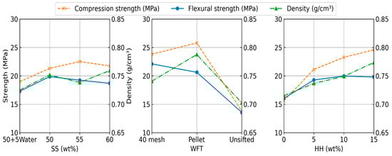 HH and SS fractions along with WFT, and interactions between SS fraction and WFT significantly (p < 0.01) affected the compression strength. WFT accounted for 55.3% of the variation, HH fraction accounted for 21.2%, all other factors and interactions contributed less than 10% each. The main effects for density, flexural and compression strengths are plotted in Figure 6. Interaction plots are shown in Supplementary Materials Figures S7–S15. Typical Stress–strain curves for the flexural tests are shown in Figure 7.