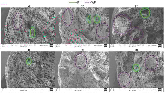 Figure 8. SEM micrographs for formulations containing 55 wt% SS, and (a) 5 wt% HH, 40 mesh WF; (b) 5 wt% HH, pellet WF; (c) 5 wt% HH, unsifted WF; (d) 15 wt% HH, 40 mesh WF; (e) 15 wt% HH, pellet WF; (f) 15 wt% HH, unsifted WF.