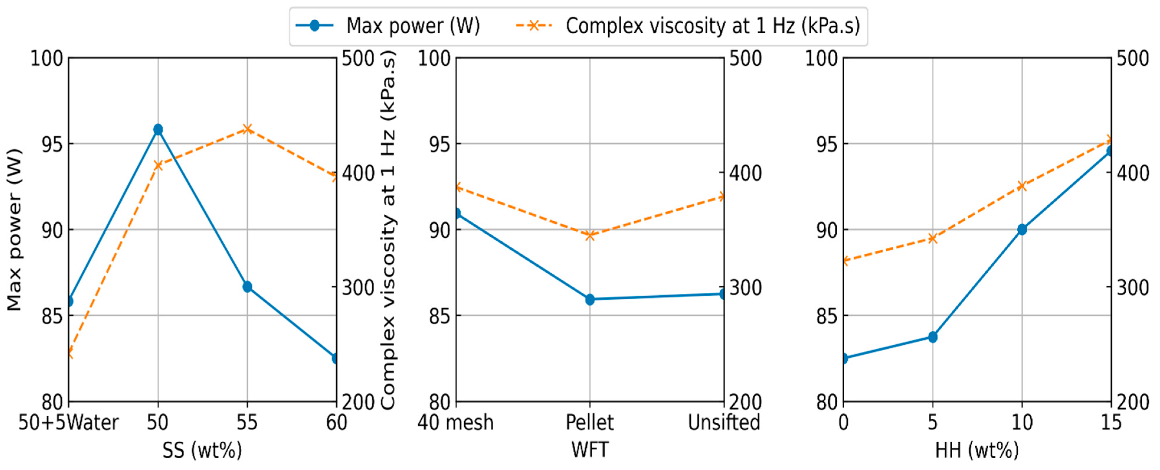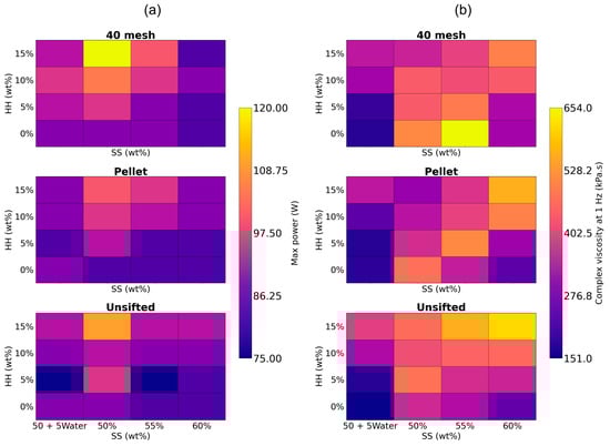 Contour plots for maximum motor power during extrusions and the average complex viscosity for the formulations are shown in Figure 10a,b, respectively. Motor power was highest (95.8 W) at 50 wt% SS and decreased as the SS fraction was increased (86.7 and 82.5 W at 55 wt% and 60 wt% respectively). This is expected, as increasing the SS fraction increases the liquid content of the composite, reducing inter-particle friction and making the overall extrusion process easier. The substitution of water for SS also yielded a comparable reduction in motor power (85.8 W) due to the same mechanism. Motor power increased with increasing HH fractions (from 82.5 W at 0 wt% to 94.6 W at 15 wt%) due to the relatively small particle size of HH, which significantly increases the total fiber surface area. This increased surface area requires more SS solution to wet the particles, effectively making the composite formulation drier [33]. Extrusion power was high for 40 mesh WF (90.9 W) but was lower for pellet WF (85.9 W) and unsifted WF (86.2 W), which is similarly explained by the finer particle size for 40 mesh WF.