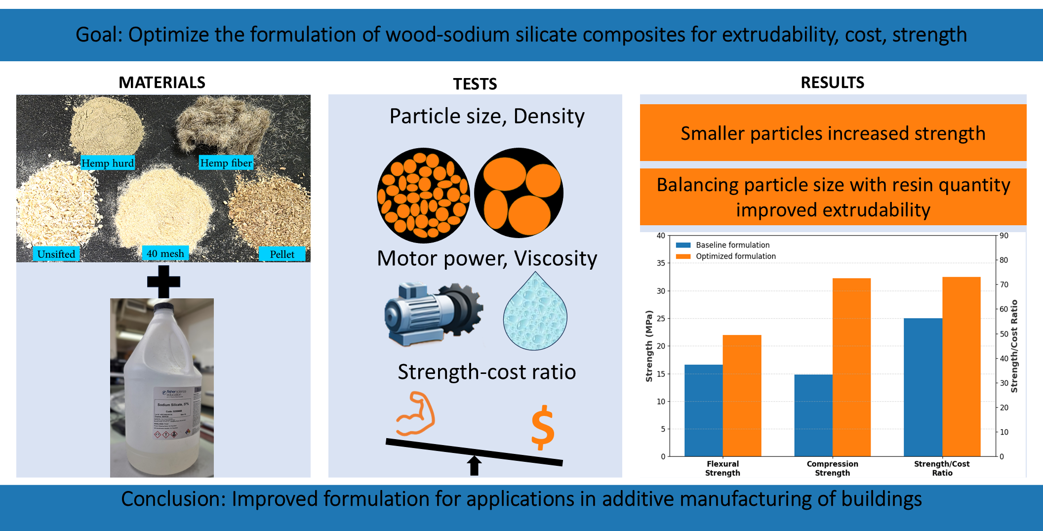 Despite these advancements, a comprehensive evaluation of diverse formulations, including a rigorous cost analysis of the materials, remains lacking for wood–thermoset polymers in AM applications. This study addresses this gap by exploring novel material combinations. Specifically, we investigate the use of wood pellets as an alternative to sifted wood fibers, while incorporating HH as a reinforcement, along with the HF used in prior work [8]. HH has never been demonstrated as a reinforcement for primarily bio-material based additive manufacturing. It was previously observed [8] that low liquid (SS) content significantly increased the motor power required during extrusion; therefore, this study also explores whether substituting a portion of the SS with added water can reduce the power demand while maintaining mechanical strength.