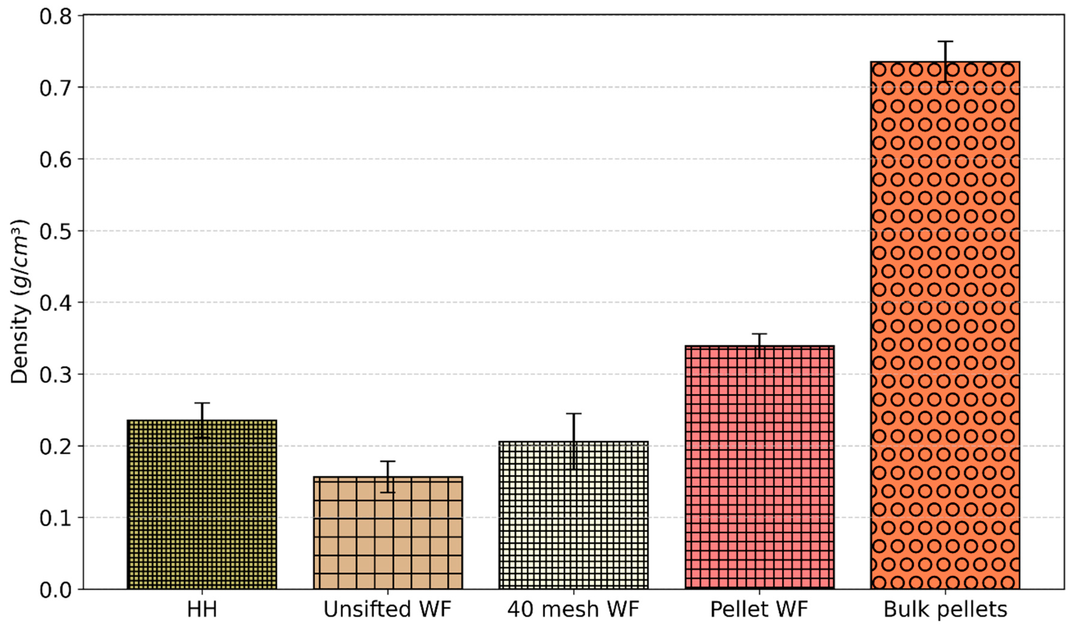 Bulk densities of WF and HH were measured by calculating the mass of materials, (HH, unsifted WF, 40 mesh WF, bulk pellets, and pellet WF) in a 500 mL container, performed in triplicate. The mass was then divided by the volume to calculate the densities.