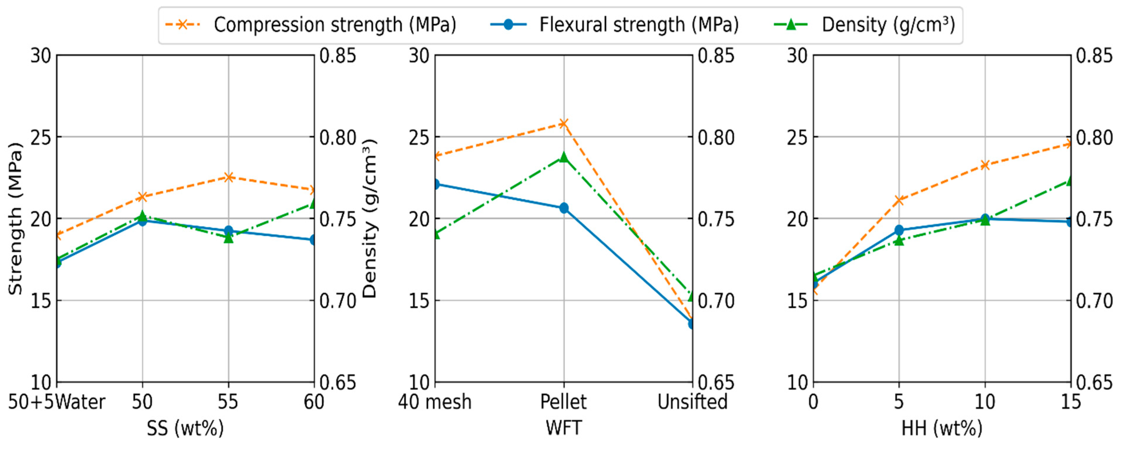 Flexural strength was generally highest for the 40 mesh WF (22.1 MPa), followed by the pellet WF (21.0 MPa). However, compression strength was generally higher for pellet WF (25.4 MPa) than the 40 mesh WF (24.6 MPa). This could be attributed to the processing of pellets during which lignin is plasticized and helps bind the wood pellets [42]. Lignin is known to improve compressive strength in many composites [20,43,44,45,46]. In addition, the higher density of pellet WF could also contribute to the compression strength of the composite by increasing its overall density. Unsifted WF consistently showed significantly lower strengths compared to the other two (13.8 and 13.7 MPa for flexural and compression strengths, respectively). This is directly attributed to the presence of substantially larger particles (>2 mm), which can disrupt the composite matrix and lead to the formation of voids, weakening the material. Average strength was similar across SS fractions. However, when water was substituted for SS, the average strength was reduced from 20.9 MPa at 55 wt% to 18.2 MPa at 50 + 5Water. The highest average strengths were at 60 wt% SS, 15 wt% HH, for 40 mesh (28.5 MPa) and pellet WF (27.5 MPa). These values represent an increase of 81.5% and 75%, respectively, over the average strength of the original 40 mesh WF—50 wt% SS composite (15.7 MPa) prepared and tested under similar conditions [8].