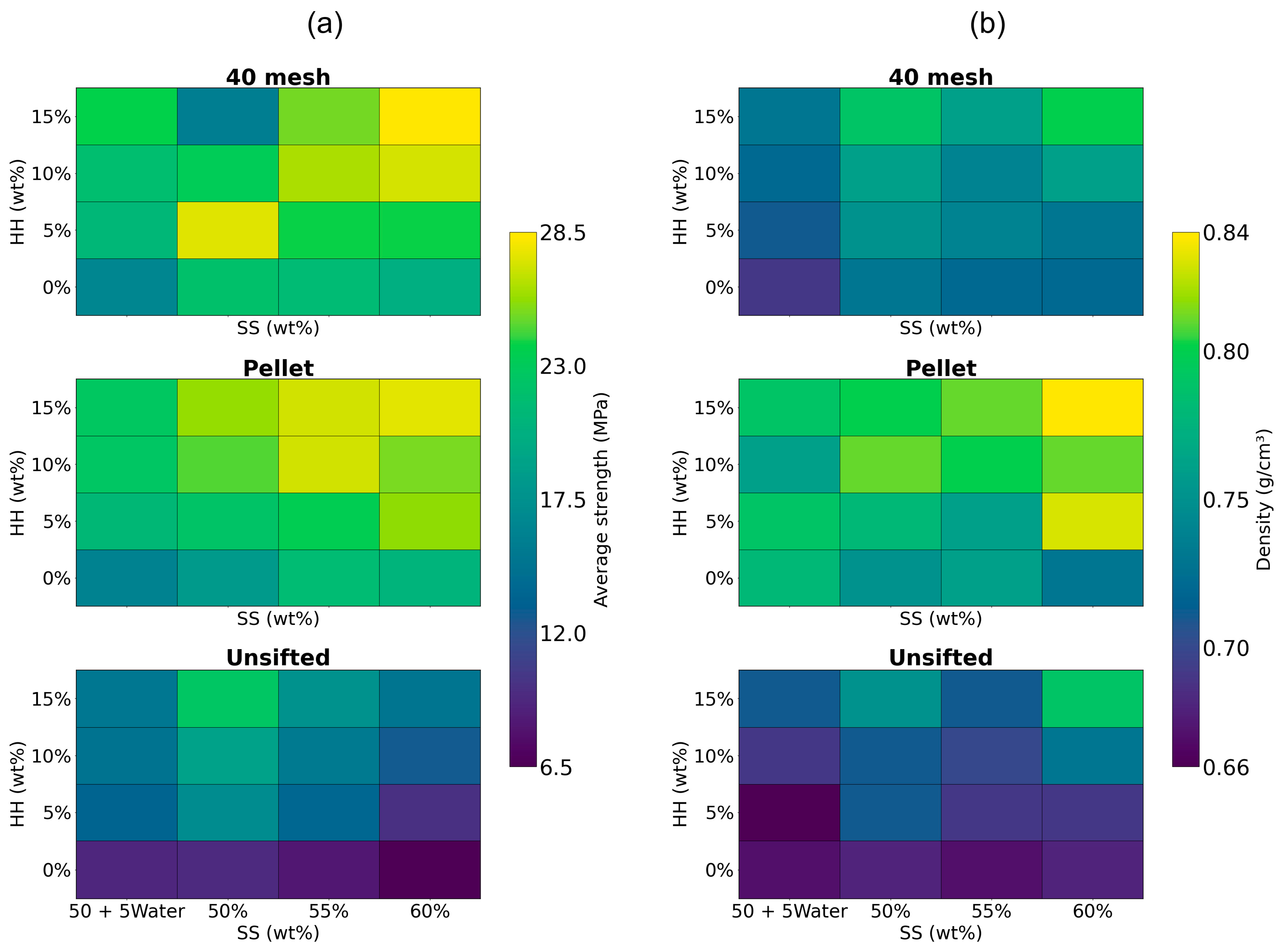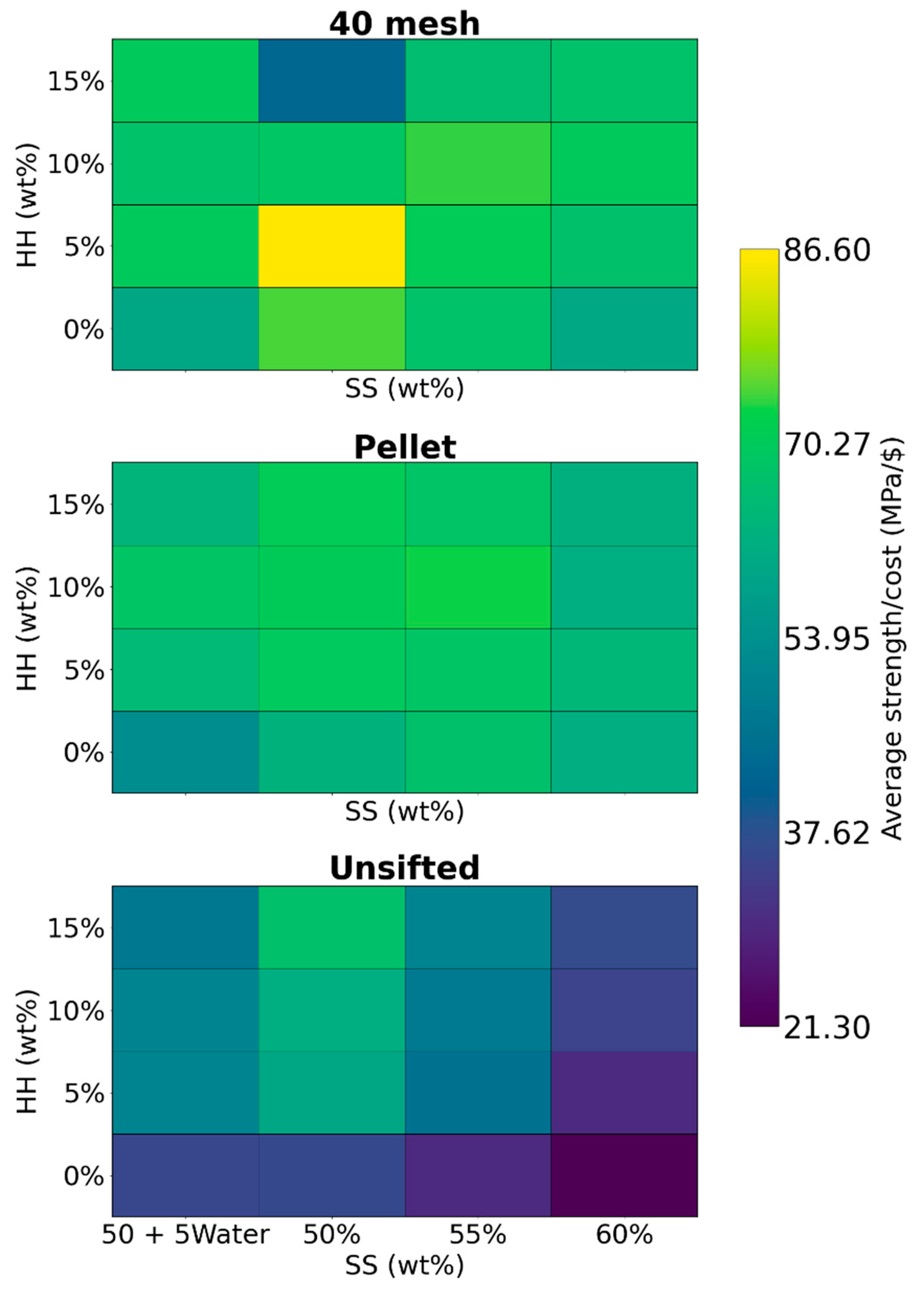Based on these values, the average material cost for preparing a 60 g (dry basis) composite batch was calculated to be $0.39 (SD $0.03). Strength-to-cost ratios ranged from 21.3 MPa/$ for the formulation with unsifted WF, 0 wt% HH, and 60 wt% SS to 86.6 MPa/$ for the formulation with 40 mesh WF, 5 wt% HH, and 50 wt% SS.