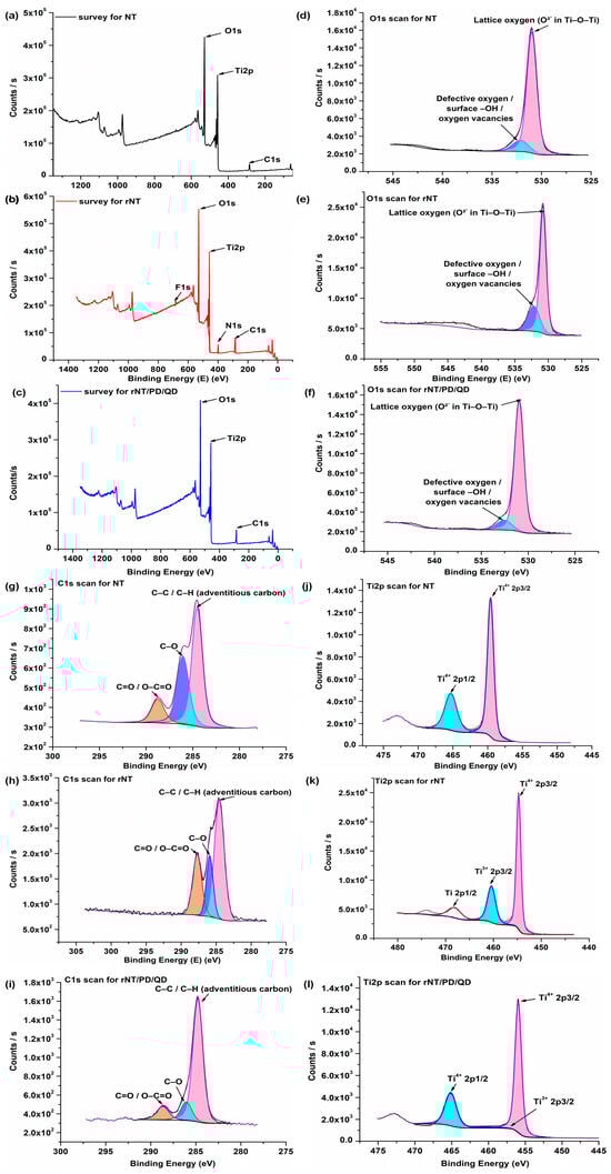 Curve fitting of the high-resolution C 1s spectra of the NT, rNT, and rNT/PD/QD samples (Figure 4g–i) reveals three main components centered at binding energies of approximately 284.8 eV, 286.0 eV, and 288.0 eV. The peak at ~284.8 eV is attributed to C–C/C–H bonds arising from adventitious carbon, while the component at ~286.0 eV corresponds to C–O and C–N species. The higher binding energy peak at ~288.0 eV is associated with carbonyl and carboxyl groups (C=O and O–C=O), in agreement with previous reports [30,31,32]. In the rNT/PD/QD sample, the relative intensity of the carbonyl-related component increases, which is consistent with the presence of quinone-type structures formed during the oxidative polymerization of dopamine, thereby confirming the successful deposition of the polydopamine layer [33].