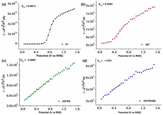 M-S plots for: (a) NT, (b) rNT, (c) rNT/PD, and (d) rNT/PB/QD electrodes.