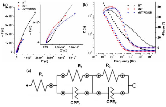 The EIS spectra recorded using Ag/AgCl 3 M KCl reference to study the interface between modified Ti surfaces (NT, rNT, and rNT/PD/QD) and 0.9% NaCl electrolyte were further compared in Figure 6. Figure 6a shows the Nyquist plot, and Figure 6b Bode diagram. To determine the most likely electrical equivalent circuit for the tested samples shown in Figure 6c, EIS data were fitted using NOVA 1.11 software. The data show that all samples exhibit considerable stability. The Nyquist impedance diagram in certain instances does not display a complete semicircle, as seen in Figure 6a. The heterogeneity present on the electrode surface induces frequency dispersion, resulting in this phenomenon [41]. The diameter of the semicircular capacitive loops exhibits a gradual rise from NT to the rNT/PD/QD sample. Capacitive loops with larger diameters provide enhanced corrosion resistance. The findings may indicate that reduction and decoration with quantum dots via dopamine might facilitate charge transfer accessibility. Also, in the Bode diagram (Figure 6b), rNT, and rNT/PD/QD samples had lower impedance modulus. All samples show comparable capacitive behavior in the lower and medium frequency domain, with almost the same slope for rNT and rNT/PD/QD.