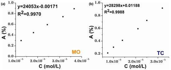 Standard calibration curves for (a) MO solution; (b) TC solution.