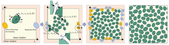 For the n-th candidate fiber that may intersect the inner window boundary, the placement proceeds as follows: First, the geometric parameters (, , , , ) are sampled according to the previously described rules. Using Equation (4), boundary points on the corresponding ellipse are computed. If any of these points intersects or extends beyond the inner window boundary, the fiber is classified as a boundary fiber. In this case, a corresponding image fiber with geometric parameters (, , , , ) is generated on the opposite side by applying a translation vector (±, 0) or (0, ±). The minimum edge-to-edge distance between each of fibers n and , all previously accepted fibers is then evaluated. The n-th fiber and its image are accepted only if, for both fibers, the minimum edge-to-edge distance to every accepted fiber is no smaller than . Otherwise, the candidate fiber is discarded and its center coordinates are resampled. In updating the fiber volume fraction, only the cross-sectional areas of fibers whose centers lie inside the inner window are taken into account.