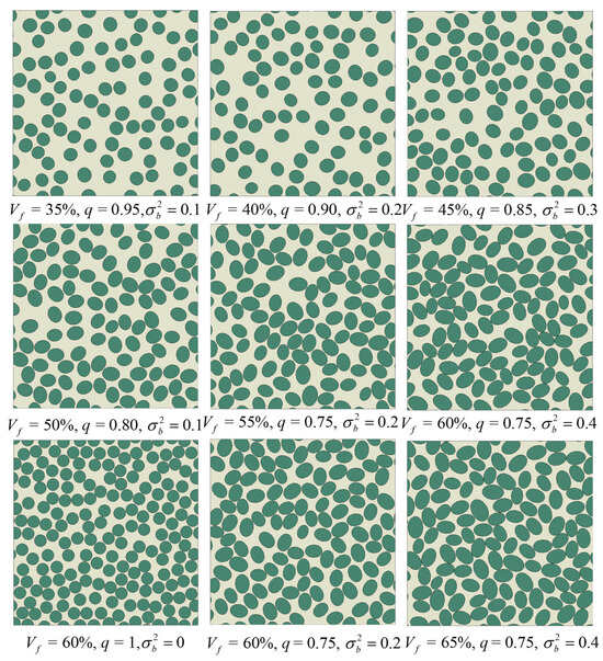 Microscopy observations reported an eccentricity of about 0.7, corresponding to 0.72 [14]. Microscopy-based diameter statistics further suggest a lognormal distribution with a variance of about 0.2 [37]. Therefore, q = 0.75, 0.80, 0.85, 0.90, 0.95, and 1.0 and = 35, 40, 45, 50, and 55% [35] are adopted to construct a series of elliptical-fiber RVEs, thereby bracketing the microscopy-observed ellipticity level while retaining the circular limit, in order to compare the relative influence of aspect ratio and fiber volume fraction on the transverse tensile response and to examine their effects on the stress–strain behavior and damage evolution. In addition, for the parameter subset with = 45% and 50% and q = 0.75–1.0, RVEs are further generated by prescribing the semi-minor axis lengths to follow normal distributions with variances of 0.0, 0.1, 0.2, and 0.3 [37] so that the influence of semi-minor-axis scatter can be assessed in a controlled manner while keeping the nominal fiber volume fraction and aspect ratio unchanged.
