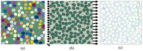 Overall procedure for microstructure generation, finite element modelling, and transverse tensile loading. (a) Generate microstructure; (b) Mesh generation and imposition of boundary conditions; (c) Crack propagation process.