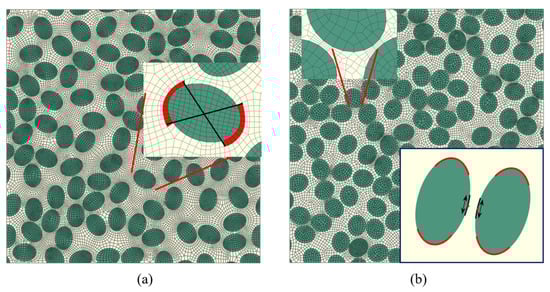 For = 35% (Figure 14), changing the aspect ratio mainly redistributes high-stress regions without significantly altering the overall crack trajectory. When q = 0.95 (Figure 14a), high equivalent stress forms relatively wide and continuous band-like regions between fiber rows perpendicular to the loading direction, spanning multiple inter-fiber gaps and being distributed rather uniformly. When q is reduced to 0.75 (Figure 14b), the high equivalent stress is instead concentrated in a few thinnest matrix ligaments and in local neighborhoods near some elliptical fiber ends, and the high-stress regions appear as discrete patches or short bands. In both cases, crack evolution follows a similar pattern: fine cracks first nucleate in the highly stressed interfacial layers, then successively penetrate neighboring matrix ligaments, and finally coalesce into a main crack path that traverses the cross-section perpendicular to the loading direction.