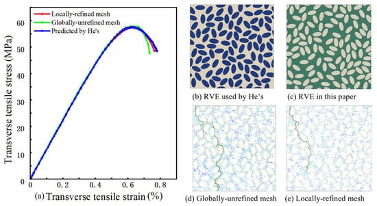 Model verification and comparison of mesh refinement strategies: (a) predicted transverse stress–strain curves compared with reference results; (b,c) corresponding RVE microstructures; (d,e) predicted crack paths under transverse tensile loading for different mesh refinement strategies.