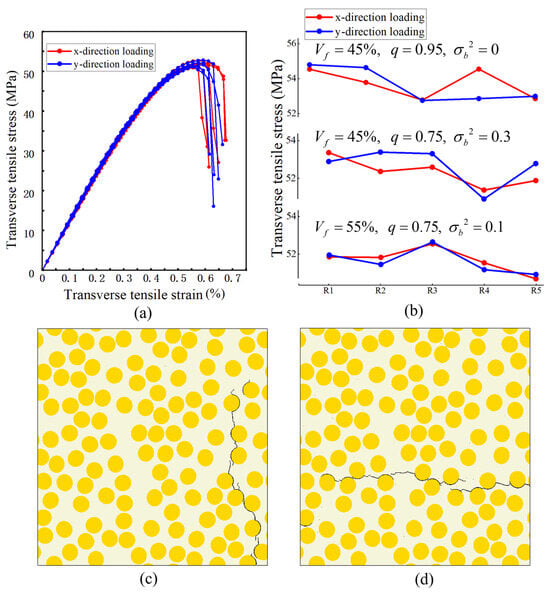 At the ply scale, the transverse response of UD plies is commonly treated as approximately transversely isotropic in the plane normal to the fibers; therefore, x- and y-direction transverse loading are expected to yield broadly comparable responses in a statistical sense. To quantify the inherent variability introduced by random microstructural arrangement, an additional dispersion analysis was carried out on three representative parameter combinations: (i) fiber volume fraction 45%, aspect ratio 0.95, and zero semi-minor-axis variance; (ii) fiber volume fraction 50%, aspect ratio 0.75, and semi-minor-axis variance 0.3; and (iii) fiber volume fraction 55%, aspect ratio 0.75, and semi-minor-axis variance 0.1. For each combination, five independent RVE realizations (R1–R5) were generated using the same validated procedure, and transverse tension was applied along two orthogonal in-plane directions to avoid bias associated with an arbitrary coordinate choice. Figure 7a shows the stress–strain curves for the representative 55% case, where the pre-peak responses remain closely clustered across realizations. Figure 7b summarizes the peak stresses of all realizations for the three parameter sets. The coefficient of variation in peak stress across realizations remains low (about 1.3–1.9%), indicating limited realization-to-realization scatter for the examined cases. Representative crack patterns under the two orthogonal in-plane loadings are shown in Figure 7c,d, and the failure morphology remains dominated by interfacial debonding followed by matrix cracking through the thinnest ligaments.
