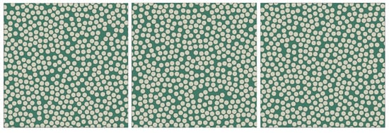 To evaluate the capability of the microstructure generation algorithm to maintain spatial randomness at high fiber volume fractions, four commonly used statistical descriptors are employed: the nearest-neighbor distance distribution [41], the angular distribution of nearest neighbors [42], Ripley’s K function K(r) [42], and the radial distribution function g(r) [43]. To ensure statistical comparability with the results reported in reference [44], the input parameters for microstructure generation (, , , q, , ) are set to (165 m, 165 m, 60%, 1, 3.3 m, 0.1 m), where all length-type parameters are expressed in μm. A total of 20 independent RVE samples are generated, and three of these samples are shown in Figure 8.