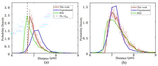 The nearest-neighbor distance distribution characterizes the probability density of the distance from a given fiber to the center of its closest neighboring fiber [41], and is used to quantify short-range exclusion effects and local spatial uniformity. In the statistical analysis, each fiber center is taken as a reference point, the distances to all other fiber centers are computed, and the first and second nearest-neighbor distances are extracted to construct their empirical distributions, as shown in Figure 9.