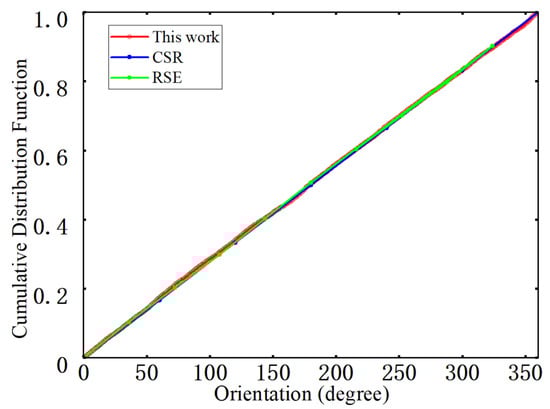 The angular distribution of nearest-neighbor fiber pairs in the cross-section is used to characterize the in-plane orientation of nearest-neighbor directions and to detect possible preferred directions or anisotropy [42]. In the statistical procedure, the angle between each nearest-neighbor vector and the horizontal axis is mapped into the interval [0, 360°), and the cumulative distribution function (CDF) is computed, as shown in Figure 10. The figure compares nearest-neighbor orientation CDFs from experiments, the RSE model, and the present generation algorithm. The three curves nearly overlap and are close to a straight line over the entire angular range, indicating that the nearest-neighbor orientations are approximately uniformly distributed in the plane without any pronounced preferred directions. The curve corresponding to the generation algorithm used here varies smoothly with only small fluctuations and remains consistent across the 20 RVE realizations, reflecting good directional randomness and statistical stability. Under the high fiber volume fraction considered, the generated microstructures therefore satisfy both the non-overlapping constraint with a prescribed minimum edge-to-edge distance and the requirement of random nearest-neighbor orientation, and the fiber arrangement can be regarded as statistically isotropic in the plane.