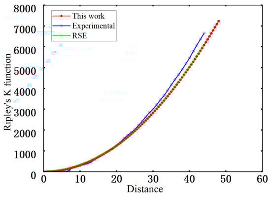 Ripley’s K function K(r) describes the expected number of fiber centers located within a distance r from an arbitrary fiber center in the point pattern and is used to characterize clustering or regularity at intermediate and larger length scales [42]. In this work, K(r) is evaluated from the fiber center coordinates and compared with the experimental data and the RSE-based reference curve, as shown in Figure 11. All three curves increase monotonically with and exhibit very similar trends. At short and intermediate ranges, the curve for the generated microstructures almost coincides with the experimental curve. Despite the imposed non-overlapping constraint with a minimum edge-to-edge distance, the local arrangements remain close to a random pattern. For distances larger than about 20 m, the experimental curve lies slightly above the model and RSE curves, whereas the curve for the generated microstructures nearly overlaps the RSE curve, indicating that the numerically generated structures do not introduce additional clustering at intermediate and larger scales and that their statistics are closer to a completely spatially random (CSR) pattern. Overall, the K(r) curves agree well with the reference results overall length scales, with no evidence of excessive regularity or anomalous clustering, which confirms the statistical validity and spatial representativeness of the generated microstructures at high fiber volume fraction.